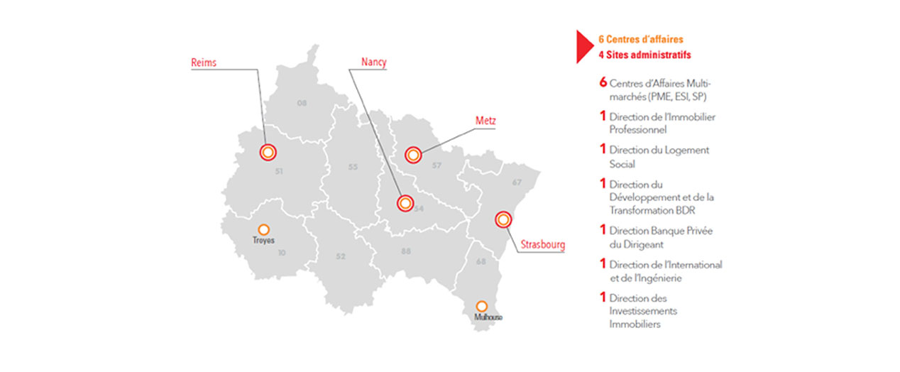 Die Caisse d’Epargne Grand Est Europe ist auf allen Ebenen vertreten, die die regionale Wirtschaftsaktivität ausmachen: Unternehmen, Akteure der Sozial- und Solidarwirtschaft, Organisationen des sozialen Wohnungsbaus und gemischtwirtschaftliche Unternehmen, Gemeinden und Akteure des gewerblichen Immobilienwesens.